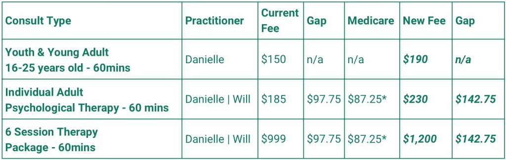 From the 6th of January 2026 our consultation fees will increase. This change is due to rising operating costs, regulatory and registration fee increases, and the need to retain skilled staff so we can continue delivering safe, high quality evidence-based care.
